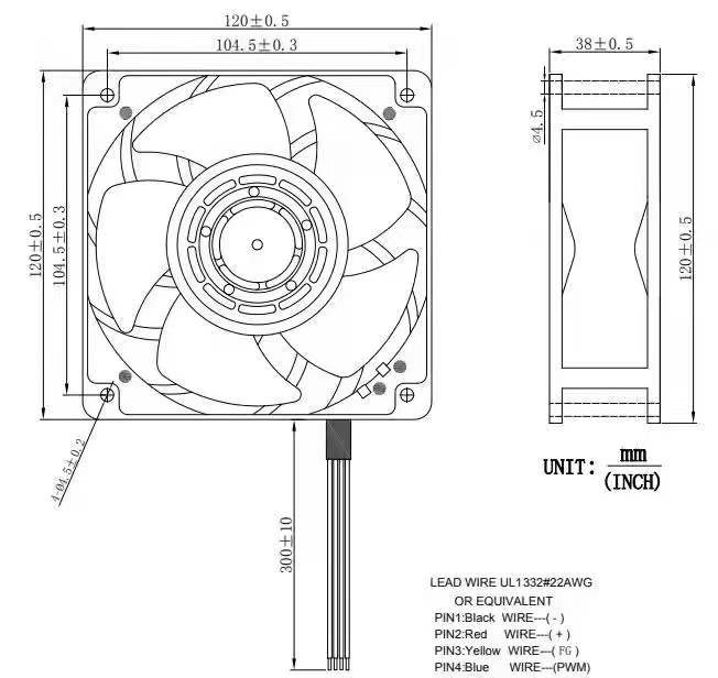120x120x38 mm, with the highest air flow : 11000rpm, air volume 311.68 CFM, static pressure 162.89 Ps (mmH2O),